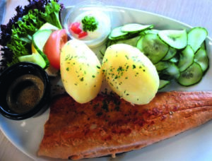Lene, som fortsatt lever et nitrist kjøttløst liv som vegetarianer, skamroste den stekte ørreten. Hun mente den smakte veldig likt den egenfiskede vi får i Rauland – en hederbetegnelse i seg selv. Fisken var åpenbart fersk, perfekt stekt og kom med deilig klassisk tilbehør.
